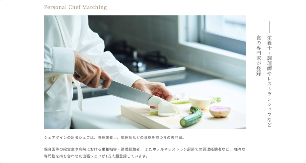 シェアダインは、自宅やオフィスにプロのシェフが出張し、料理を調理・提供するサービスです。